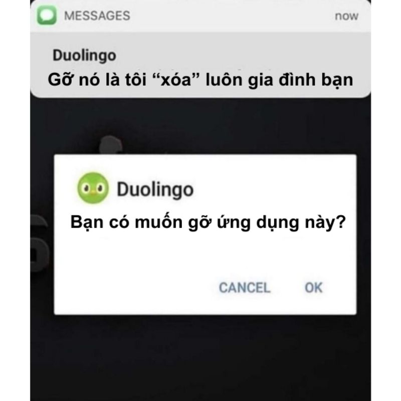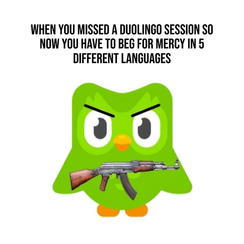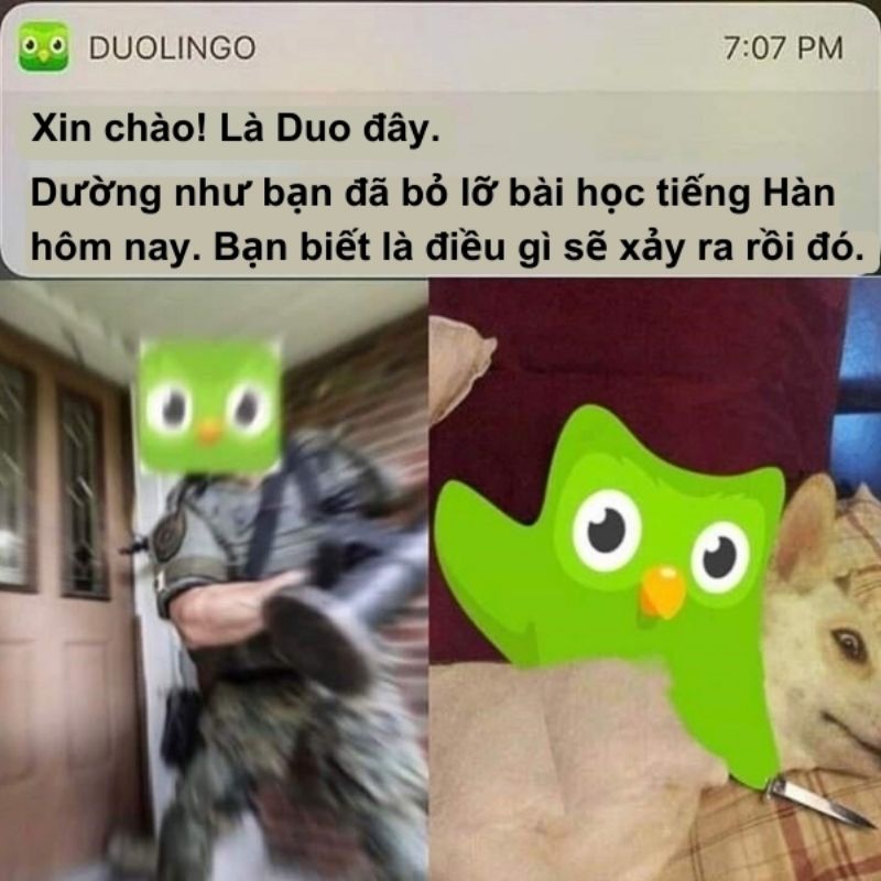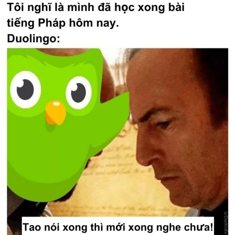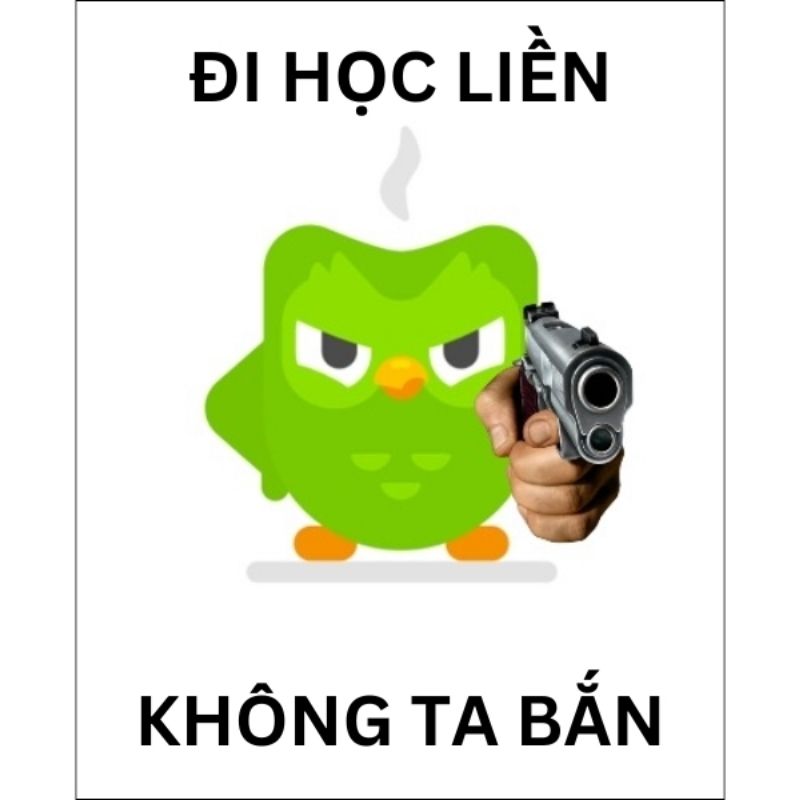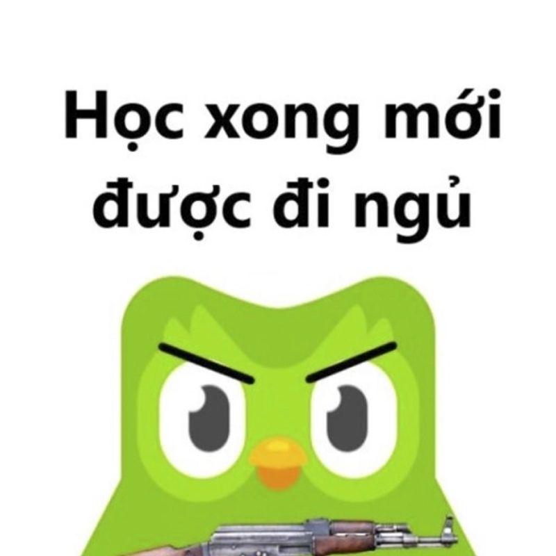 Meme Duolingo là ảnh chế được lấy cảm hứng từ chú cú xanh Duo – linh vật biểu tượng của ứng dụng học ngoại ngữ Duolingo. Điểm đặc trưng của meme này là biến những lời nhắc học tập thành các tình huống “đe dọa” hài hước.