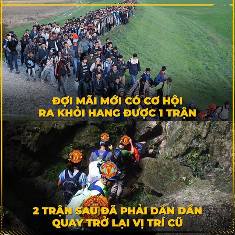 Meme MU chui vào hang là một trong những dạng nội dung được chia sẻ nhiều nhất sau mỗi trận thua của Manchester United. Hình ảnh chui vào han” mang ý nghĩa tượng trưng cho sự trốn tránh, xấu hổ hoặc thất vọng thường được fan dùng để miêu tả cảm xúc của mình sau khi đội bóng có kết quả không như mong đợi.